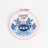 4 x Cross stitch patterns including Cake Club, Coffee Club, Plant Club and Bee Club. 3 x 6” Hoops in lemon, pink and blue 4 x White cross stitch fabric 20 x Skeins of thread Cross stitch needle