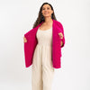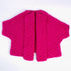 The Luna Cardigan is photographed in The Chunky Yarn in the colour Bright Pink. The model is wearing size medium.